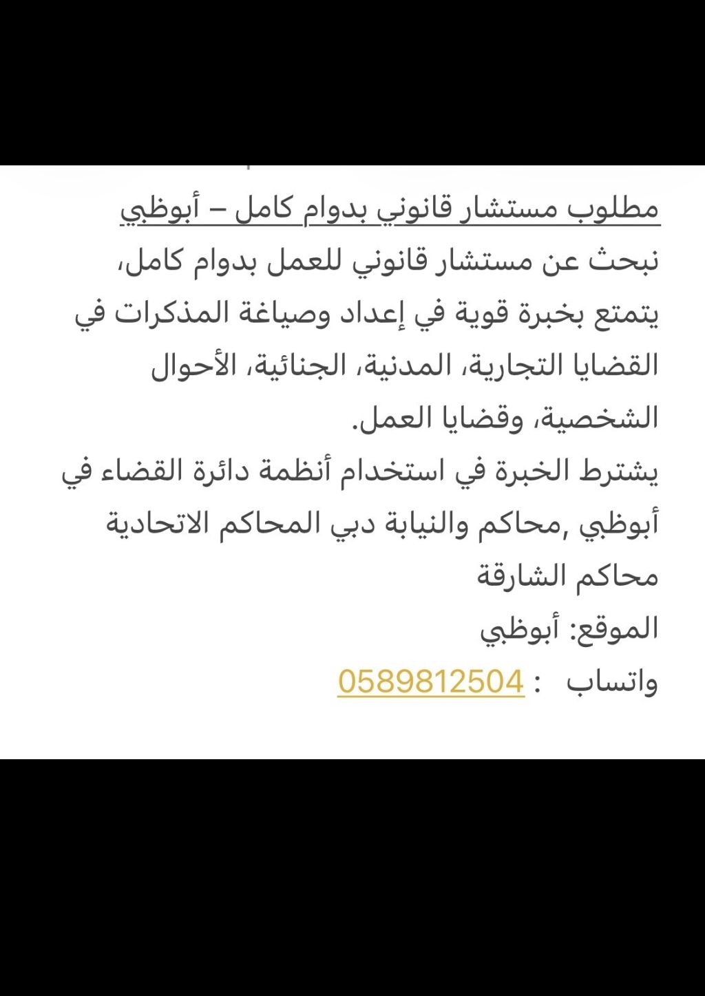 نبحث عن مستشار قانوني للعمل بدوام كامل، يتمتع بخبرة قوية في اعداد وصياغة المذكرات في القضايا التجارية، المدنية، الجنائية، الأحوال الشخصية، وقضايا العمل. يشترط الخبرة في استخدام أنظمة دائرة القضاء في أبوظبي، محاكم والنيابة دبي المحاكم الاتحادية محاكم الشارقة الموقع أبوظبي