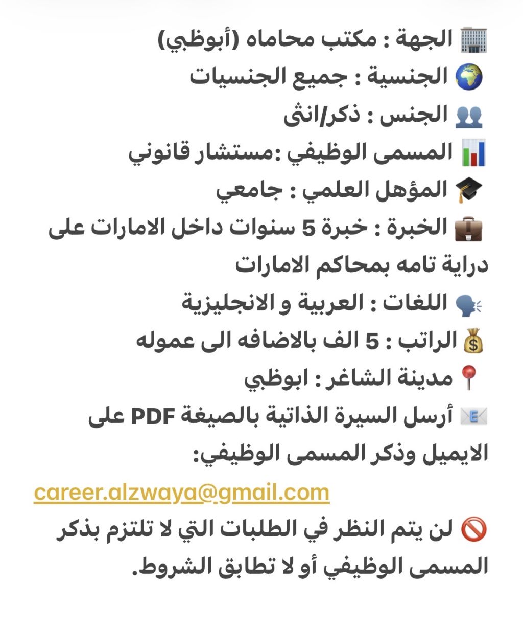مطلوب مستشار قانوني خبرة في الامارات وعلى دراية تامة بمحاكم الامارات براتب 5 ألف وعمولة لمكتب محامه في امارة أبوظبي الكورنيش لمن لديه الشروط ارسال CV على الايميل