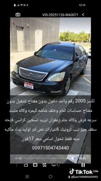 للبيع: لكزس LS430 فل كامل موديل 2005، بصمة، دخول بدون مفتاح، تشغيل بدون مفتاح، فتحة سقف، مثبت سرعة، حساسات أمامية وخلفية، تبريد وتسخين كراسي، ذواكر مقاعد، كراسي كهربائية أمامية، ستارة خلفية، شاشة وكالة مع كاميرا، جير تيبترونيك 6 غيارات، تواير جديدة، ملكية سنة كاملة، رقم مرتب (38606)، خالي من الحوادث، داخل زعفران. السعر: 17,000 درهم.