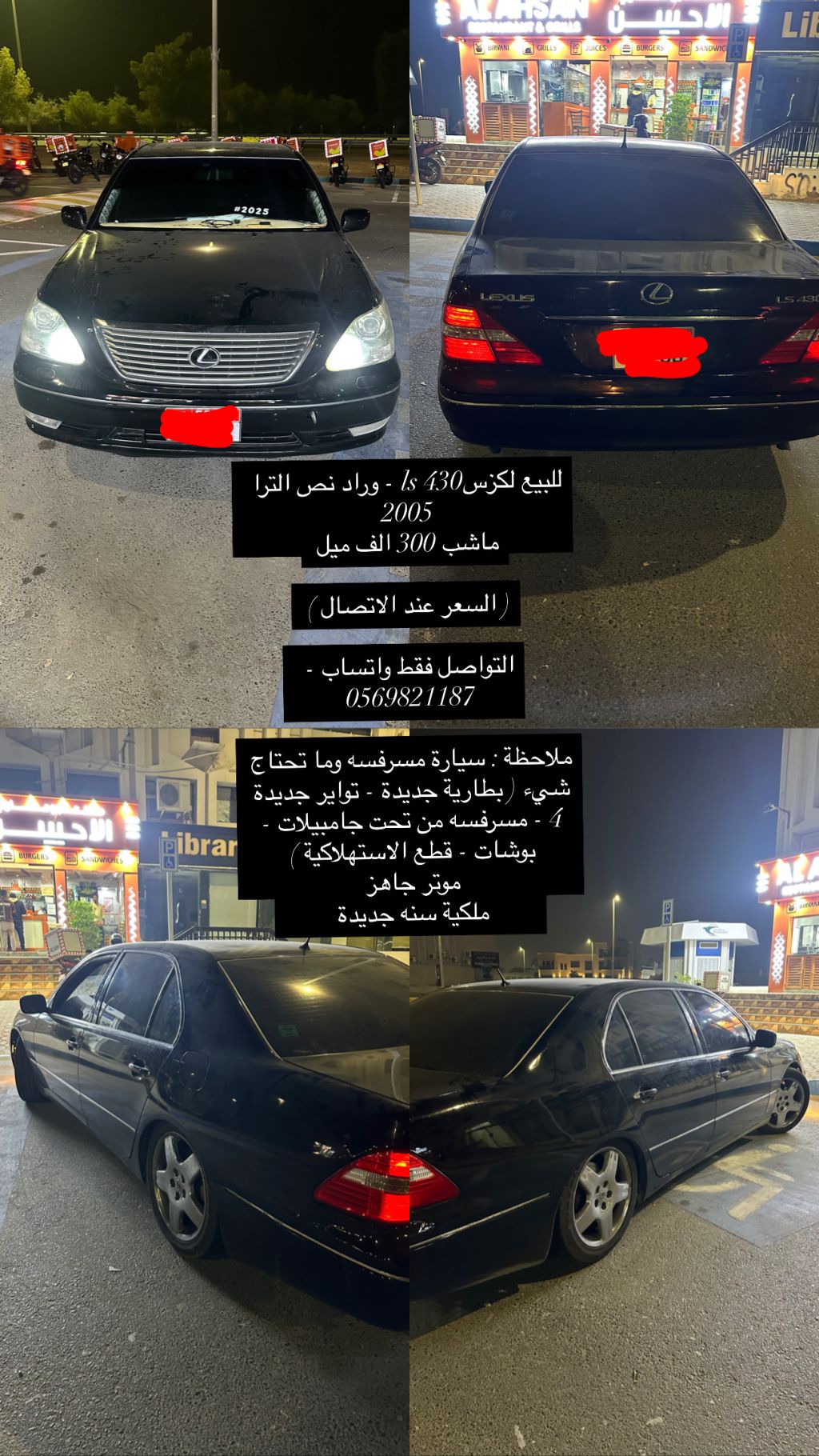 للبيع: لكزس LS 430 - نصف الترا 2005، الممشى 300,000 ميل (السعر عند الاتصال). التواصل عبر واتساب فقط. ملاحظة: السيارة مسرفسة ولا تحتاج إلى شيء (بطارية جديدة - 4 إطارات جديدة - مسرفسة من تحت، بيلات - بوشات - قطع استهلاكية). المحرك جاهز، الملكية سنة جديدة.