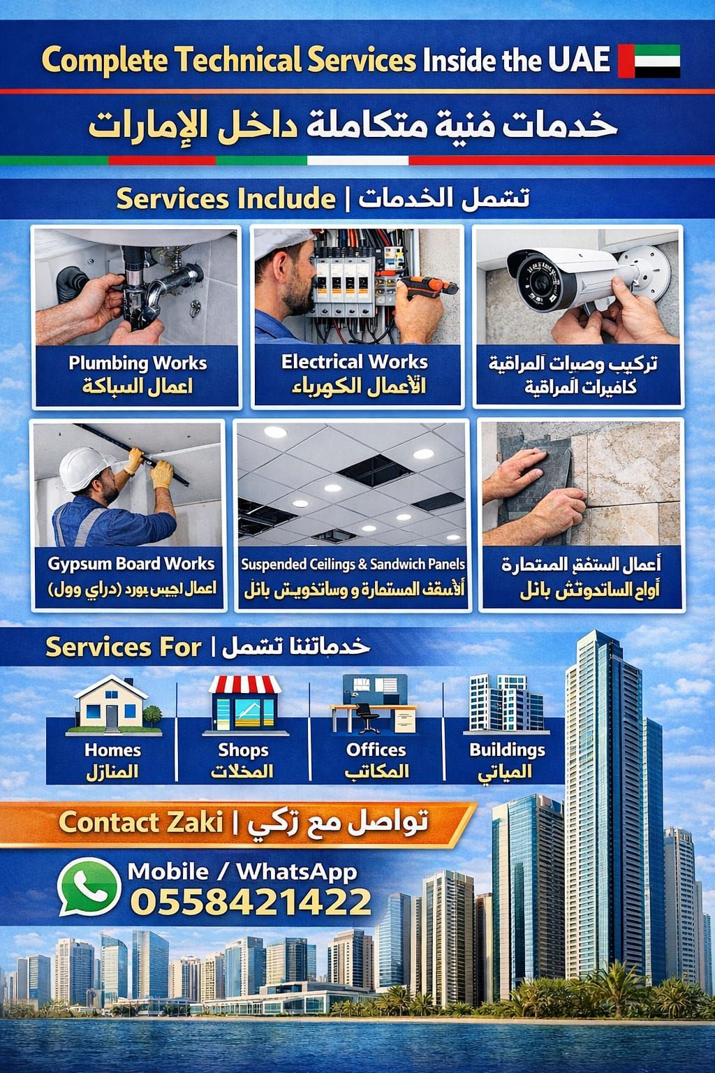 نحن نقوم بأعمال الكهرباء الصحية (السباكة) وأعمال الديكور السندوتش بنل وتركيب CCTV كاميرات