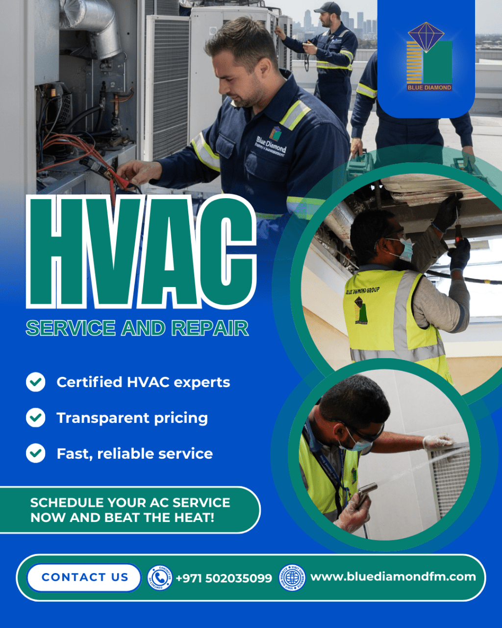 بلو دايموند. هواء بارد. أداء سلس. لماذا تختارنا خبراء معتمدون في أنظمة التكييف والتبريد خدمة سريعة وموثوقة أسعار واضحة وشفافة خدمات احترافية لصيانة واصلاح اجهزة التكييف دعم صيانة موثوق في جميع أنحاء الامارات حافظ على كفاءة جهاز التكييف لديك وتجنب الأعطال المفاجئة وضعف التبريد وتكاليف الاصلاح المرتفعة. احجز خدمة صيانة واصلاح التكييف اليوم اتصل الآن بلو دايموند، نقدم حلولا موثوقة لإدارة