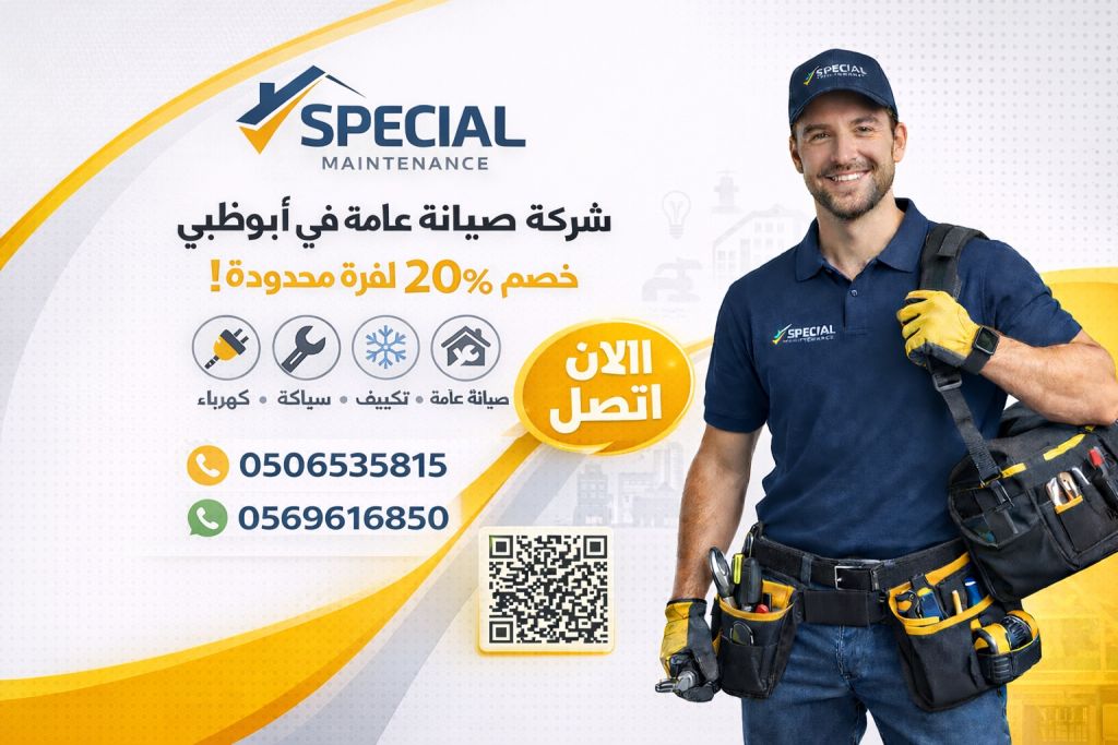 شركة صيانة عامة في أبوظبي خدمة 24 ساعة خصم 25% لفترة محدودة نقدم جميع أعمال الكهرباء السباكة التكييف الصبغ صيانة المنازل بالكامل اتصل الآن واحجز خدمتك قبل انتهاء العرض