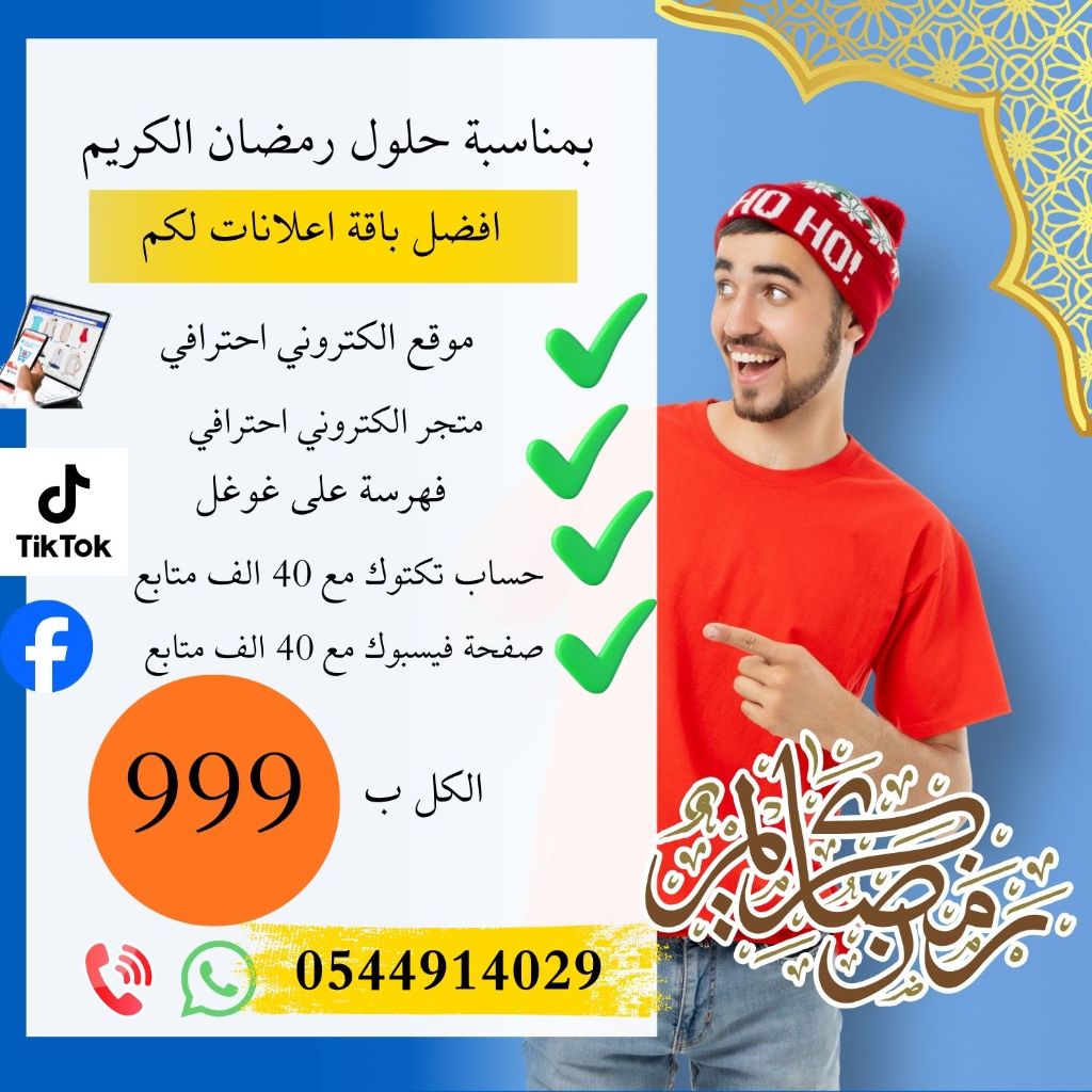 بمناسبة حلول رمضان الكريم أفضل باقة اعلانات تصميم موقع الكتروني احترافي أو متجر الكتروني يدعم عدة لغات + لوغو احترافي + حساب فيسبوك مع 40 ألف متابع عرب + حساب تكتوك مع 40 ألف متابع عرب + فهرسة على غوغل. مدة الانجاز ثلاثة أيام فقط والكل فقط ب 999 درهم