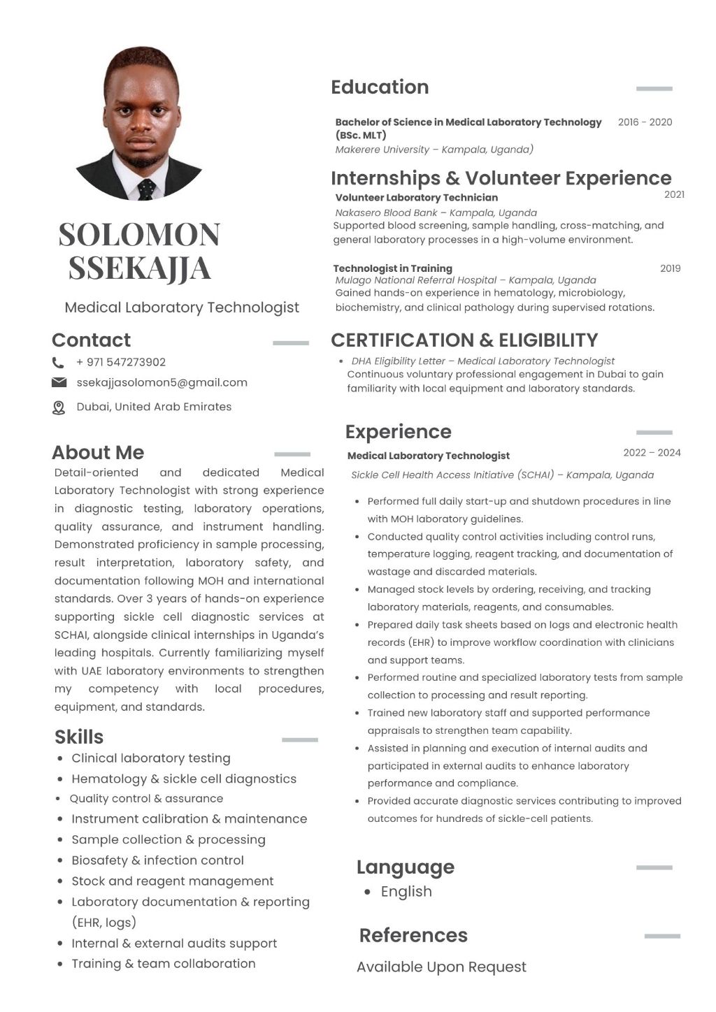 I am looking for a job as a Medical Laboratory Technologist in UAE. My name is Solomon, a Medical Laboratory Technologist with over 3 years of hands - on diagnostic experience, strong laboratory operations skills, and a solid background in hematology, sickle cell diagnostics, quality control, and instrument maintenance. I have worked as a Medical Laboratory Technologist at Sickle Cell Health Access