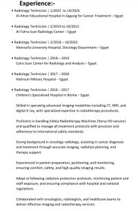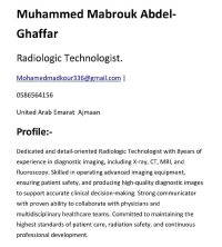 Experienced Radiographer. 8 Years MOH Licensed (UAE) Egyptian radiographer with 8 years of Previously worked in leading hospitals and medical centers inands - on experience in X ray, CT MRI, and radiation therapy. Skilled in operating advanced imaging equipment and ensuring high - quality diagnostic results