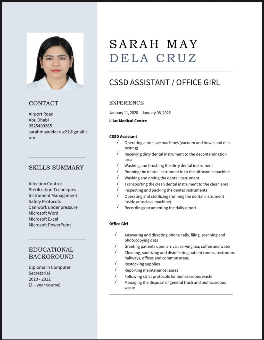 I am writing to express my interest in the CSSD position at your company. With my background of three years’ experience, I am confident I would be a valuable addition to your company. Please find my attached CV for your review. Thank you for your time and consideration. I look forward to hearing from you. Sincerely, Sarah May R Dela Cruz Sincerely, Sarah May R Dela Cruz