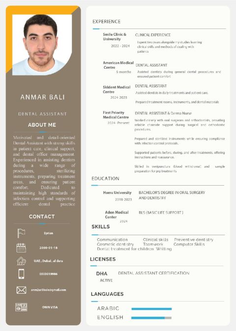 طبيب أسنان سوري الجنسية، مقيم في دبي ولدي اقامة وحاصل على ترخيص DHA كمساعد طبيب أسنان لدي خبرة سريرية كبيرة بحالات المعالجات اللبية اليدوية والألية وخبرة أيضا في معالجات اللثة والتجريف وحالات القلع والحشوات التجميلية كما لدي خبرة بمجال المساعد السني أو الممرض السني لأكثر من سنة في مركزين طبيين داخل دبي، أتحدث اللغة الانكليزية بشكل جيد جدا وابحث عن فرصة عمل في مراكز أو عيادات كمساعد طبيب أسنان