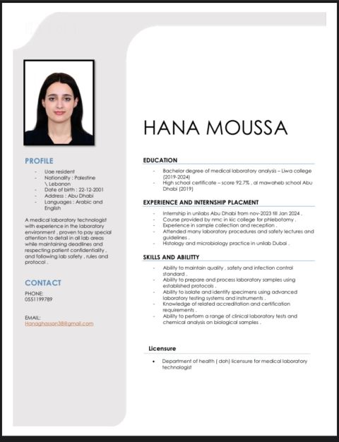 My name is Hana Moussa, and I am a graduate in Medical Laboratory Sciences. I am writing to express my interest in any available positions related to my field