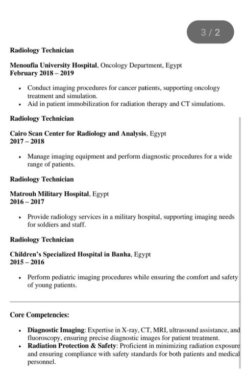 I am radiographer with 8 years experience Iwork on X ray, CT and Mri devices I have MOH License. Iwork at several Hospitals and private centre