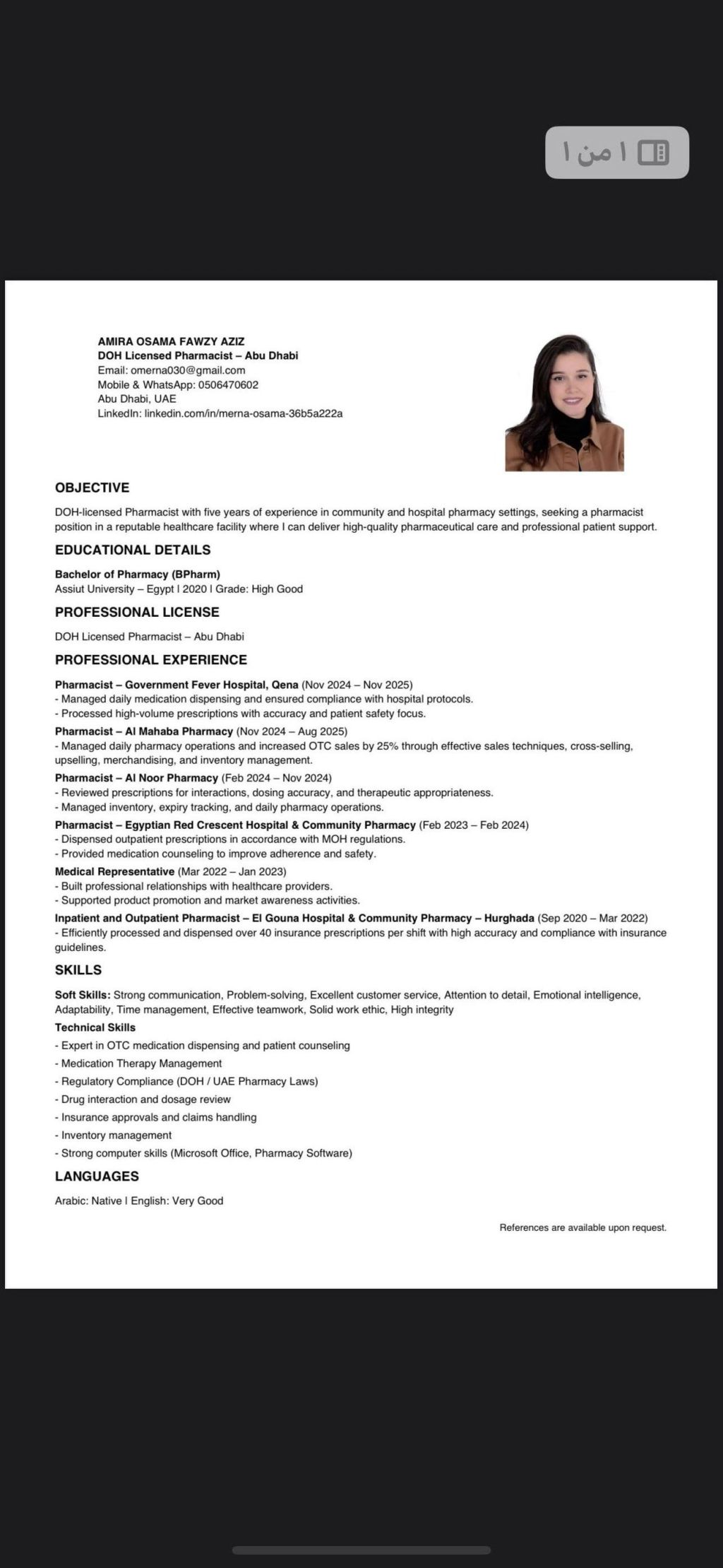 My name is amira Osama. I am pharmacist. live in Abu Dhabi. I have doh license. I am applying for a pharmacist opportunity. Kindly find the attached CV. Hoping to hear from you soon. Best Regards, Amira ossama + 9710506470602