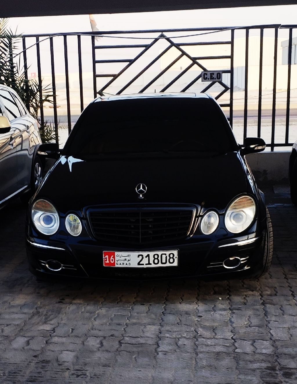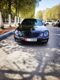 Mercedes E 230 model 2008, royal black color, with distinctive brown leather interior upholstery. Excellent condition, requires no additional expenses. Four new tires ready for travel. 2.3L economical engine, transmission, chassis, and air conditioning. One year insurance included. Mileage: 294,000 km. Price: 13,500 AED.