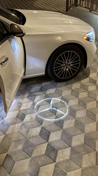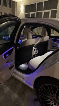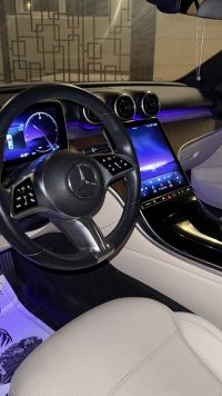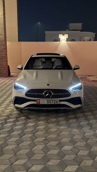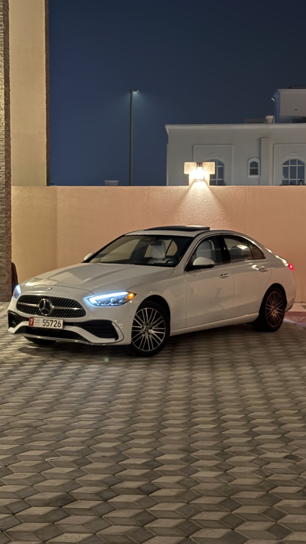 Mercedes C300 4MATIC, American import, year 2023, 4-cylinder engine, mileage 45,000 km, price 133,000 AED. Exterior color white, interior color beige with brown wood trim. Features include smart entry, fingerprint start, heated seats, seat memory, sunroof, 4 driving modes, CarPlay, 64-color ambient lighting, welcome signals, front radar, rear camera.