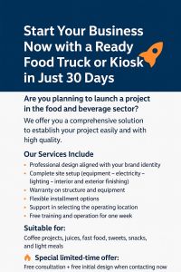 نوفر لك الحل الأسرع والأذكى فود ترك أو كيوسك جاهز 100% بتجهيز احترافي وسعر يناسب ميزانيتك للاستئجار أو الشراء، للتواصل والاستفسار