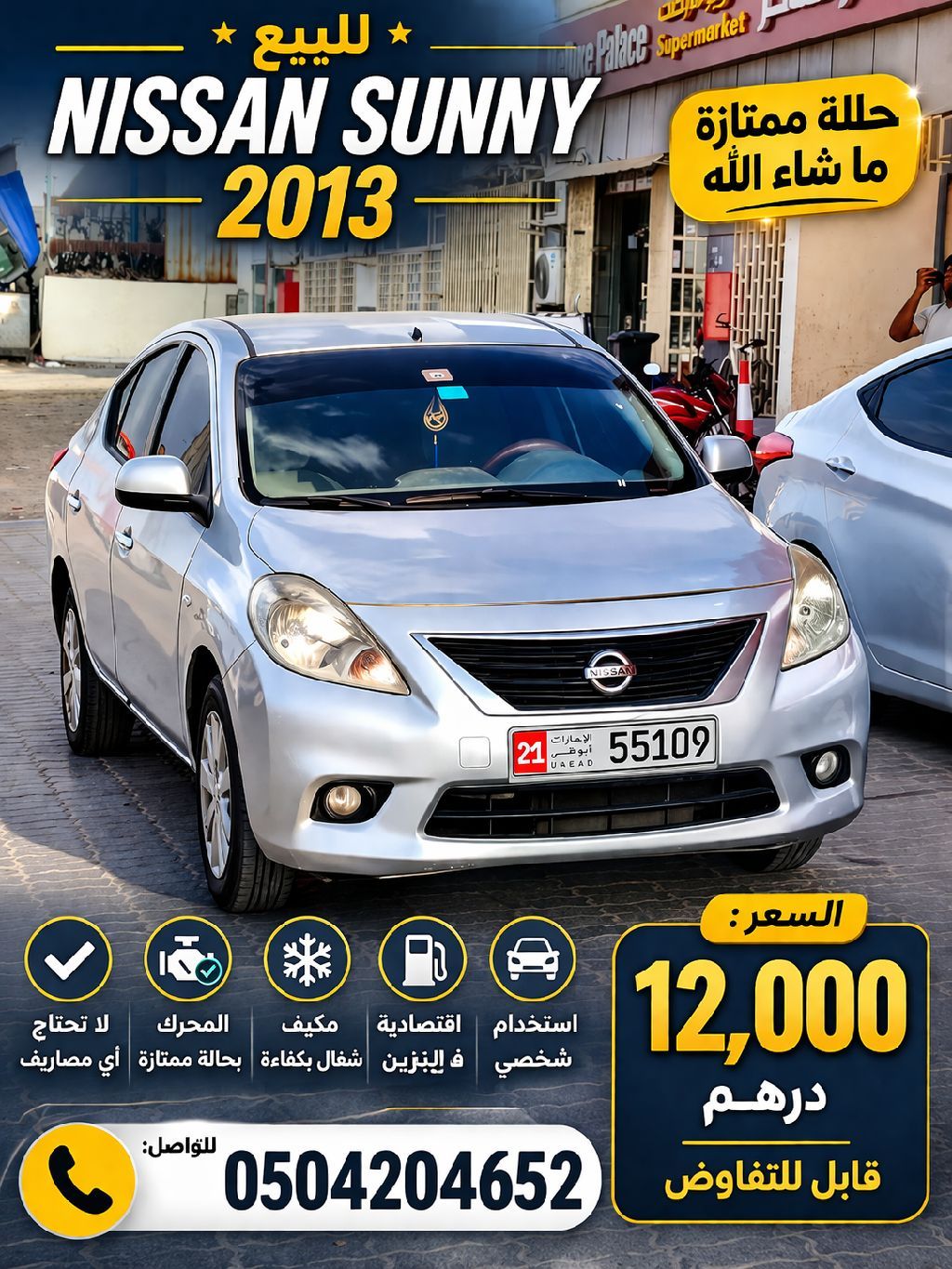 للبيع: نيسان صني 2013، بحالة جيدة - استعمال يومي، اقتصادية في استهلاك البنزين، مكيف يعمل بشكل ممتاز. السيارة جاهزة للاستخدام. السعر: 12,000 درهم قابل للتفاوض. للتواصل.