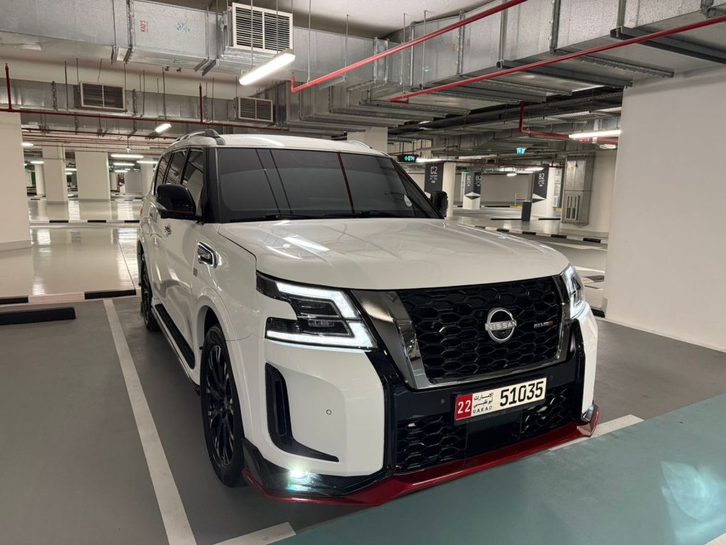 Nissan Patrol 400, eight cylinders, large engine. Specifications: GCC specs. Model: 2019. Full NISMO conversion kit 2024. Screens like the agency. Five-star cameras. Electric seat. Refrigerator. Only 140,000 km driven. Remote start. Complete new NISMO conversion 2024. Price: 114,000 AED. Contact: Abu Dhabi, Al Reem Island.