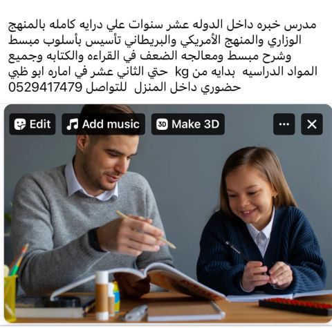 مدرس مصري خبرة داخل الامارات عشر سنوات لتدريس وتأسيس الطلاب في جميع المواد وحل ومتابعة جميع المنصات (Lms) وAlef (BravoBravo) وسيسو وتيمز وكلاس روم تدريس مناهج الوزاري والأمريكي والبريطاني ومعالجه الضعف في القراءة والكتابة في جميع المواد ومتابعة جادة وباتقان مع المدرسة وولي الأمر في كافة الامور في أبوظبي
