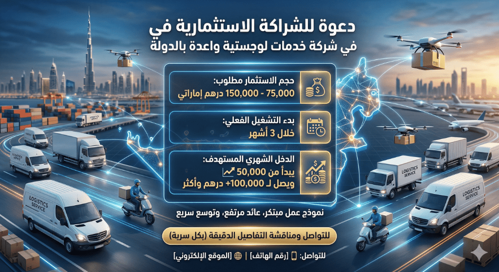 نبحث عن شريك ممول جاد لتأسيس شركة متخصصة في قطاع الخدمات اللوجستية المتنامي في الدولة. حجم الاستثمار مطلوب يتراوح بين 75000 الى 150000 درهم (حسب حصة الشراكة) خطة التشغيل جاهزية تامة لبدء العمل الفعلي خلال 3 أشهر من التأسيس. المؤشرات المالية دراسة الجدوى تؤكد خطة دخل شهري لا تقل عن 50000 درهم في المرحلة الأولى، مع امكانية مثبتة للنمو ومضاعفة الدخل لتتجاوز 100000 درهم شهريا خلال فترة وجيزة