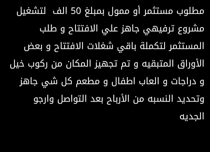 مطلوب مستثمر أو ممول بمبلغ 50 ألف لتشغيل مشروع ترفيهي جاهز علي الافتتاح وطلب المستثمر لتكملة باقي شغلات الافتتاح وبعض الأوراق المتبقيه وتم تجهيز المكان من ركوب خيل ودراجات وألعاب اطفال ومطعم كل شيء جاهز وتحديد النسبة من الأرباح بعد التواصل وأرجو الجديه التفاصيل