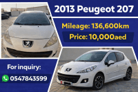 Economical car for sale: Peugeot 207, model 2013, mileage 136,600 km. Price: 10,000 UAE dirhams only. Call for details.
