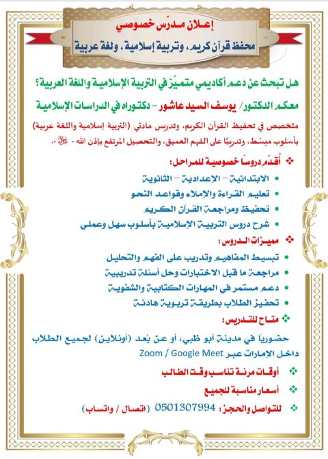 معلم في بني ياس، سوداني اعطي دروس خصوصية للصغار المناهج الصغيرة. عربي، تربية اسلاميه، علوم، رياضيات. يعني من هذا القبيل مع مراجعات للطلبة وعون لهم ويتابع معهم كل شيء. وبرامج لحفظ القرآن الكريم