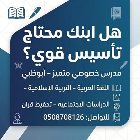 هل ابنك محتاج تأسيس قوي مدرس خصوصي - أبوظبي دروس تأسيس وتقوية في اللغة العربية - التربية الاسلامية - الدراسات الاجتماعية - تحفيظ القرآن الكريم. شرح مبسط يناسب مستوى الطالب متابعة مستمرة وتحسن واضح في النتائج اهتمام فردي بكل طالب المكان أبوظبي وضواحيها (الحضور للمنزل) للتواصل واتساب / اتصال