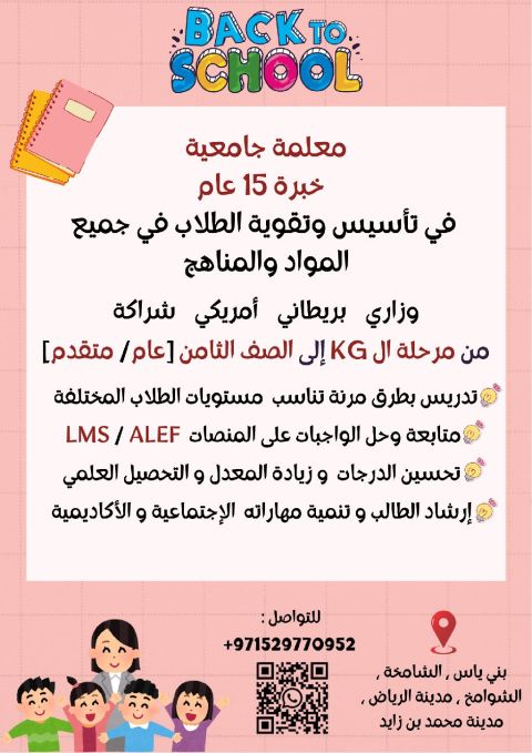 معلمة مصرية مقيمة في مدينة محمد بن زايد خبرة في تأسيس الصفوف الأولى المناهج الوزارية ومتابعة الخطة المدرسية وحل الواجبات ومراجعة قبل الامتحانات