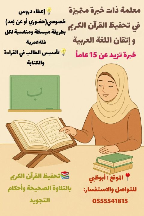 A teacher with distinguished experience in memorizing the Holy Quran and mastering the Arabic language. Over 15 years of experience. Giving private lessons, in person or remotely, in a simplified manner suitable for all age groups. Establishing the student in reading and writing. Memorizing the Quran with correct recitation and the rules of Tajweed