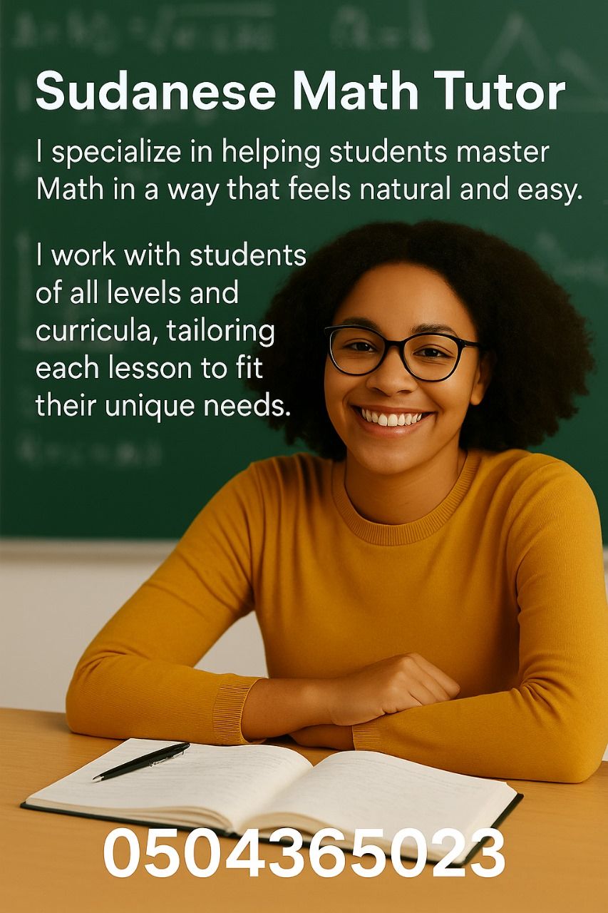 معلمة ماث سودانية متخصصه في مساعدة الطلاب على اتقان الرياضيات بطريقة سهلة ومبسطه. أسلوبي لا يقتصر فقط على حل المسائل، بل يركز على فهم المادة بعمق، وبناء الثقة، وتحويل التعلم الى تجربة ممتعة. خبرة في تدريس الرياضيات للطلاب من جميع المراحل والمناهج (أمريكي، بريطاني، كندي، وحكومي) وأخصص كل درس ليلائم احتياجات الطالب الفريدة. اذا كنت مستعدا للتغلب على الرياضيات وبناء الثقة اللازمة للنجاح، دعنا نبدأ اليوم