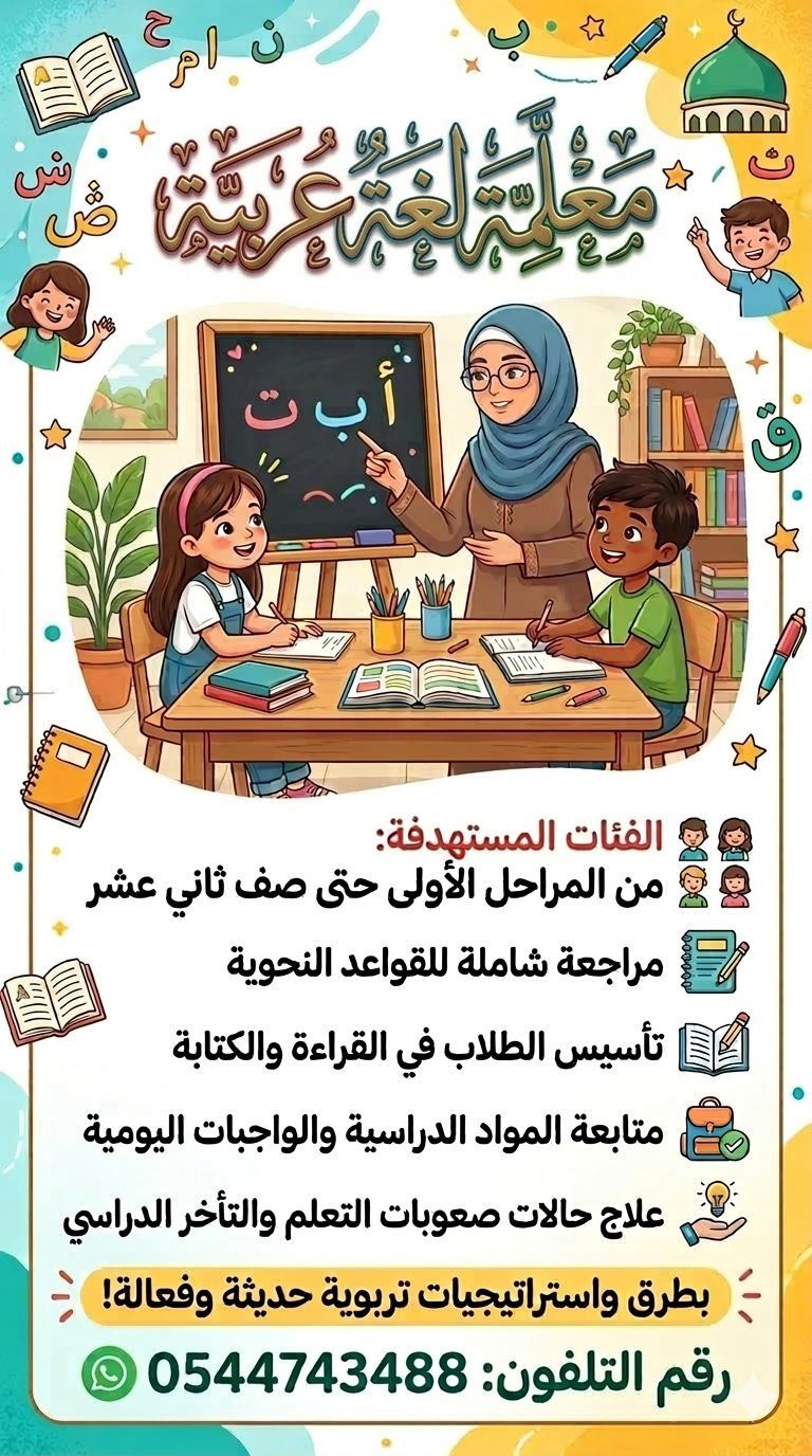 معلمة متخصصة في تدريس اللغة العربية وآدابها من المراحل الأولى حتى صف ثاني عشر ومراجعة القواعد النحوية وتأسيس الطلاب في القراءة والكتابة ومتابعة المواد الدراسية والواجبات اليومية وعلاج حالات صعوبات التعلم والتأخر الدراسي بطرق واستراتيجيات تربوية حديثة