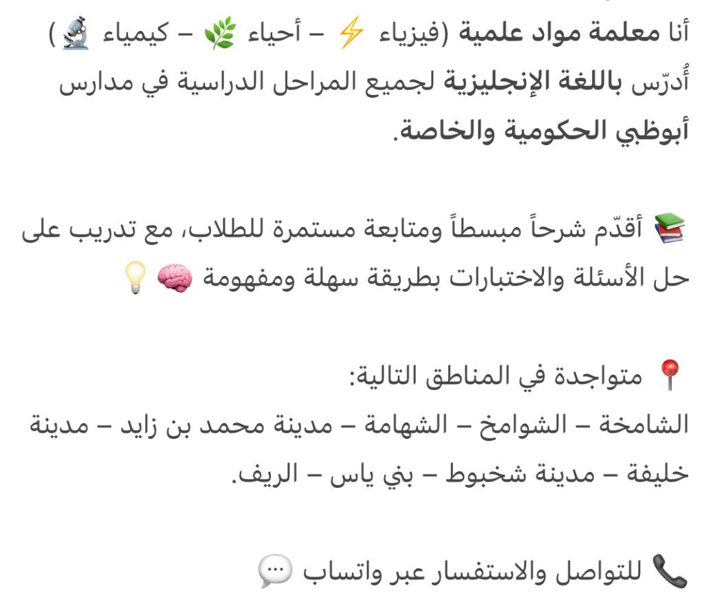 أنا معلمة مواد علمية (الفيزياء - الأحياء - والكيمياء) ولي خبرة في تدريس هذه المواد باللغة الانجليزية للمراحل الدراسية في مدارس أبوظبي فالحكومي والخاص. أقدم شرحا مبسطا ومتابعة مستمرة للطلاب، مع تدريب على حل الأسئلة والاختبارات بطريقة سهلة ومفهومة. متواجدة في أبوظبي الشامخة الشوامخ الشهامة مدينة محمد بن زايد خليفة مدينة شخبوط بني ياس الريف
