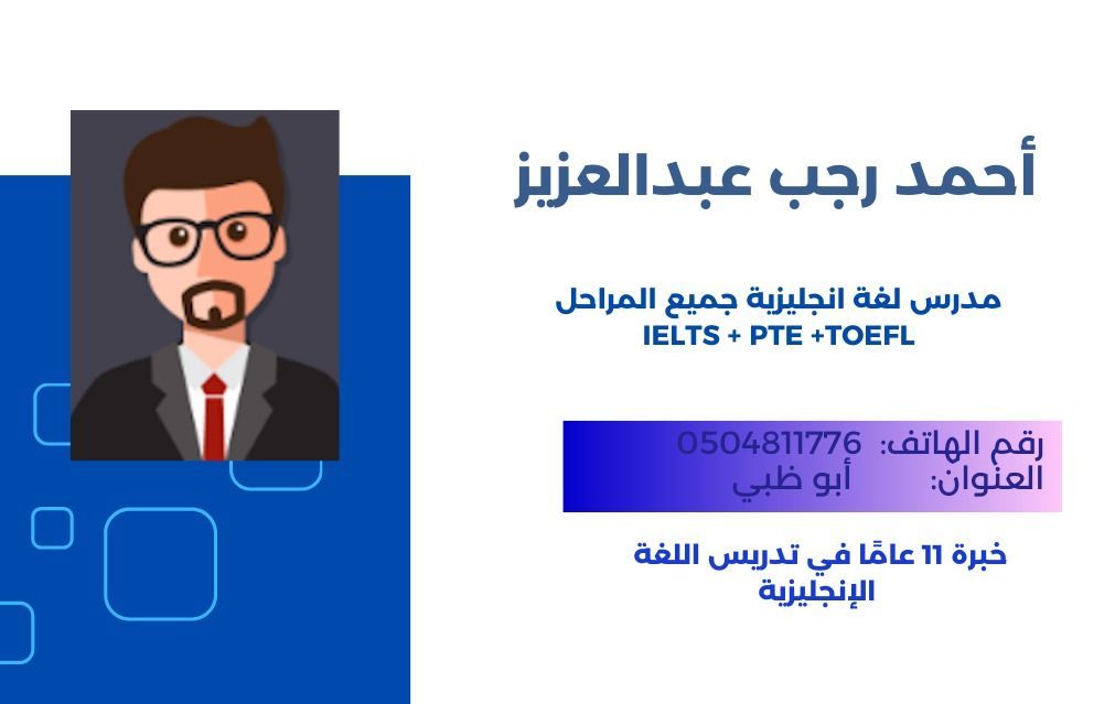 خبرة تدريس باللغة الانجليزية في الامارات والمملكة العربية السعودية بمدارس دولية. مدرس في جامعة الأهرام الكندية في مصر - قسم اللغة الانجليزية. تمهيدي ماجستير حاصل على شهادة توفل وCERF حاصل علي مؤهل تربوي حاصل على كورس TFLSHIP للمناهج وطرق التدريس. خبرة بتدريس امتحان الآيلتس والتوفل وPTE يتحدث اللغة الانجليزية بطلاقة وبطريقه نطق like native speakers
