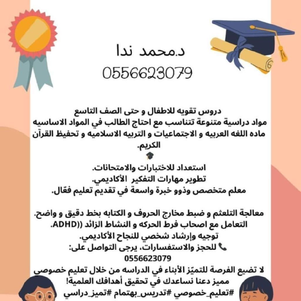 لو داخل علي الاجازة ومحتار انهض احجز لتعديل سلوك ومعالجة فرط الحركة وتشتت الانتباه وصعوبات التعلم أسس أولادك صح في المناهج الدراسية وتحفيظ القرآن الكريم بالاحكام والقصص القرآني حالات فرط الحركة وتعديل السلوك الجلسة ساعتين 100 درهم تأسيس اللغة وتحفيظ القرآن الكريم الساعتين 100 درهم تحفيظ قرآن 50 درهم الاعداد محدودة أبوظبي فقط والخارجي أون لاين من بعد 7 مساء للحجز والاستفسار تواصل اعدد محدوده