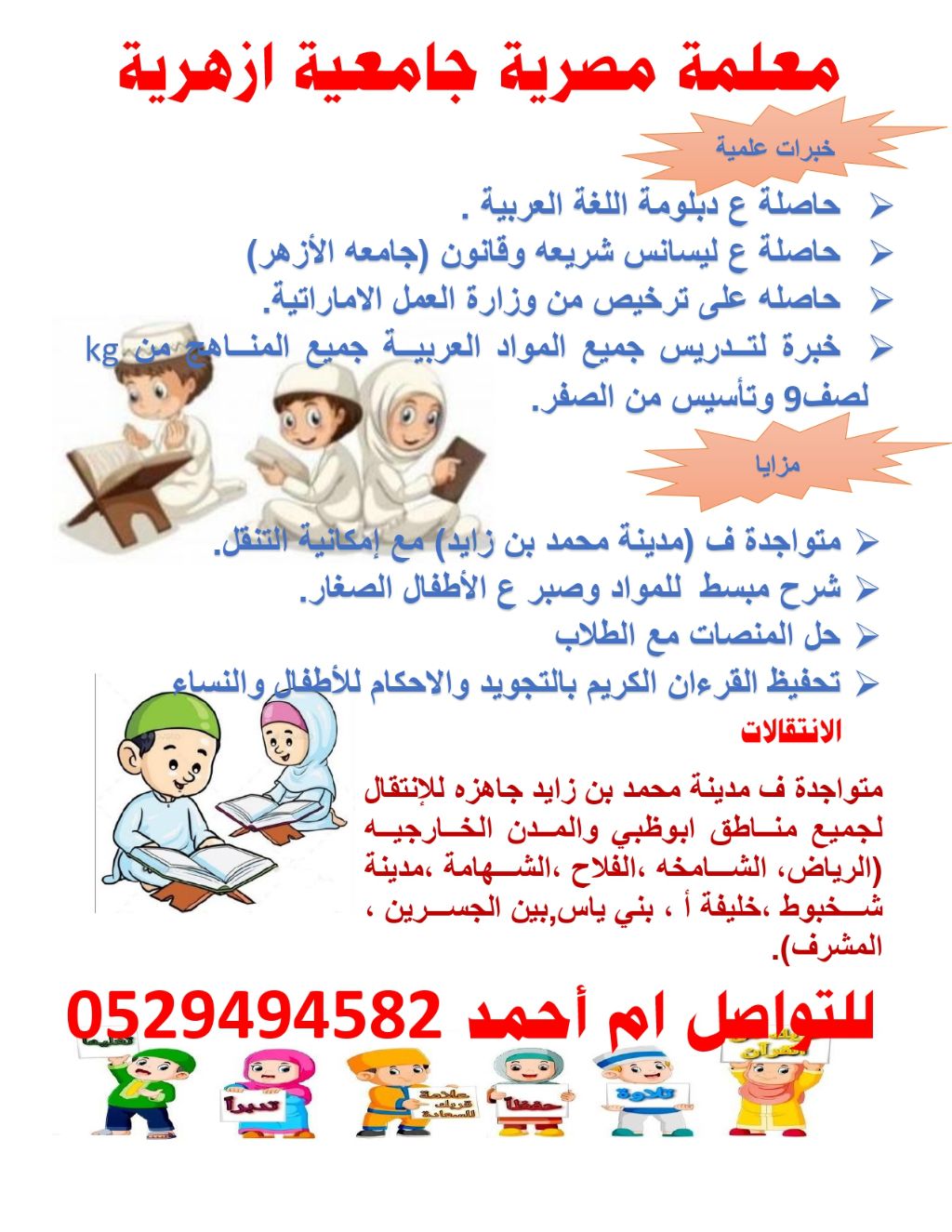 معلمة مصرية جامعية أزهرية حاصلة ع دبلومة اللغة العربية. حاصلة ع ليسانس شريعة وقانون (جامعة الأزهر) حاصله على ترخيص من وزارة العمل الاماراتية. خبرة لتدريس جميع المواد العربية جميع المناهج من KG لصف 9 وتأسيس من الصفر. متواجدة فيمدينة مدينة محمد بن زايد) مع امكانية التنقل. شرح مبسط للمواد وصبر ع الاطفال الصغار. حل المنصات مع الطلاب تحفيظ القرآن الكريم بالتجويد والاحكام للاطفال والنساء الانتقالات متواجدة