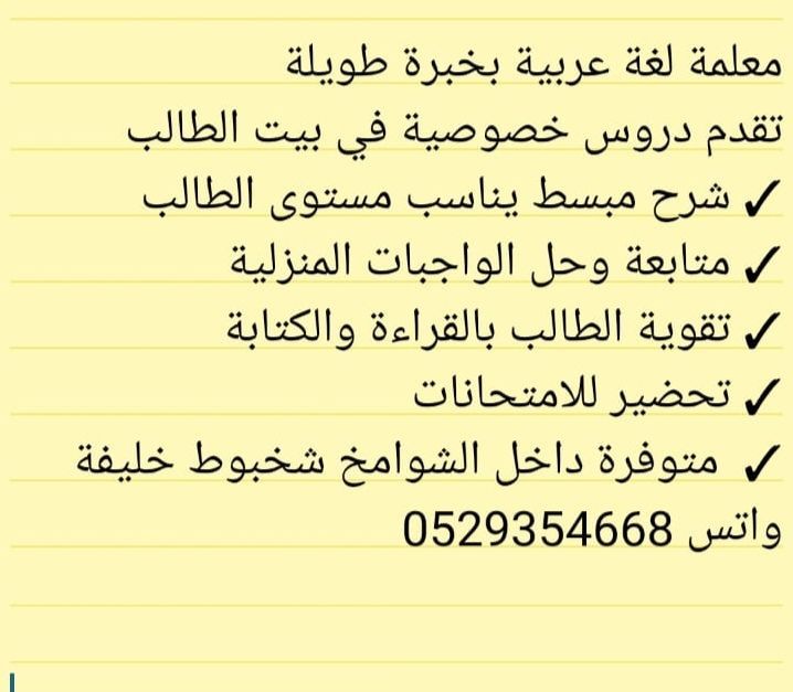 معلمة لغة عربية بخبرة طويلة تقدم دروس في بيت الطالب شرح مبسط يناسب مستوى الطالب وتقوية الطالب بالقراءة والكتابة متوفرة في أبو ظبي