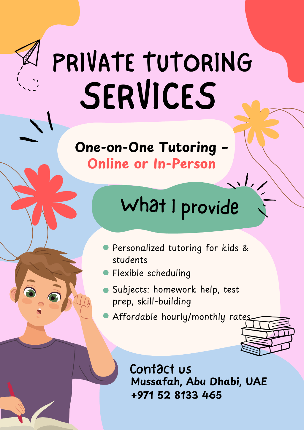 Private Tutoring in Mussafah. Personalized lessons for kids, teens, and young adults from homework help to skill - building and exam preparation. Check flyers for full details & contact info