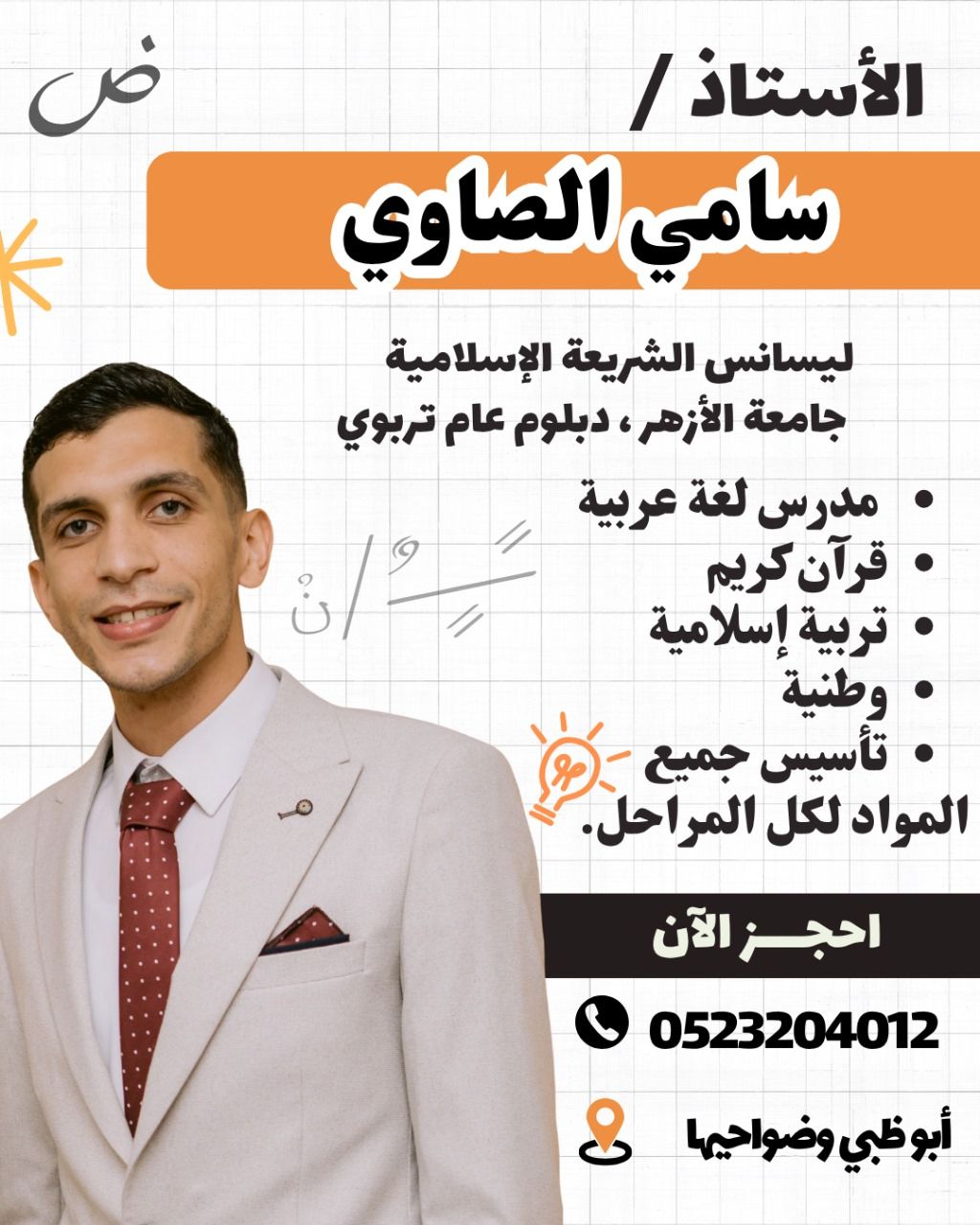 دروس تقوية في اللغة العربية وتحفيظ القرآن الكريم بالتجويد هل تبحث عن معلم متمكن يساعدك أو يساعد أبناءك في تعلم اللغة العربية (قواعد - نحو - قراءة - كتابة - تعبير) تحفيظ القرآن الكريم مع التجويد الصحيح خطوة بخطوة. مراجعة جميع المواد (متابعة مدرسية) لجميع المراحل الدراسية باحترافية وتبسيط. التدريس حضوري أسلوب مبسط وصبور يناسب جميع الأعمار