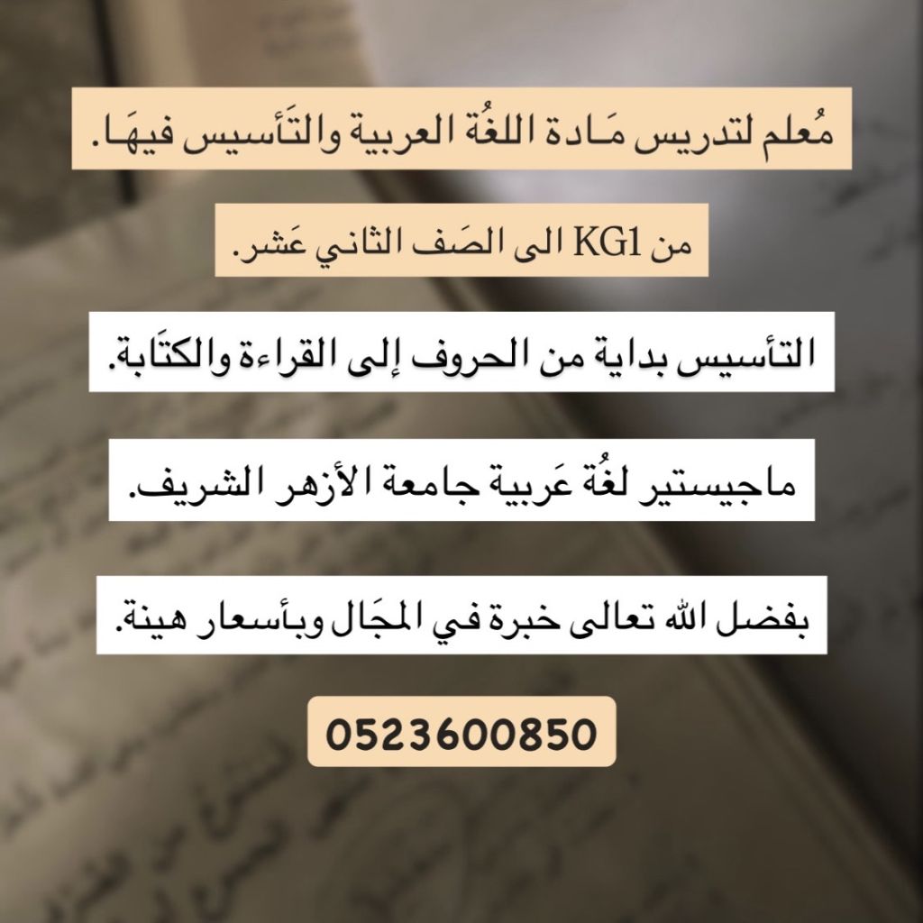 معلم لمادة اللغة العربية أدرس من الصف الأول الى الصف الثاني عشر وأيضا لتأسيس جميع المراحل العمرية في مادة اللغة العربية بداية من الحروف الى تعلم القراءة والكتابة والقواعد النحوية خبرة في جميع المناهج، وبأسعار هينة بفضل الله