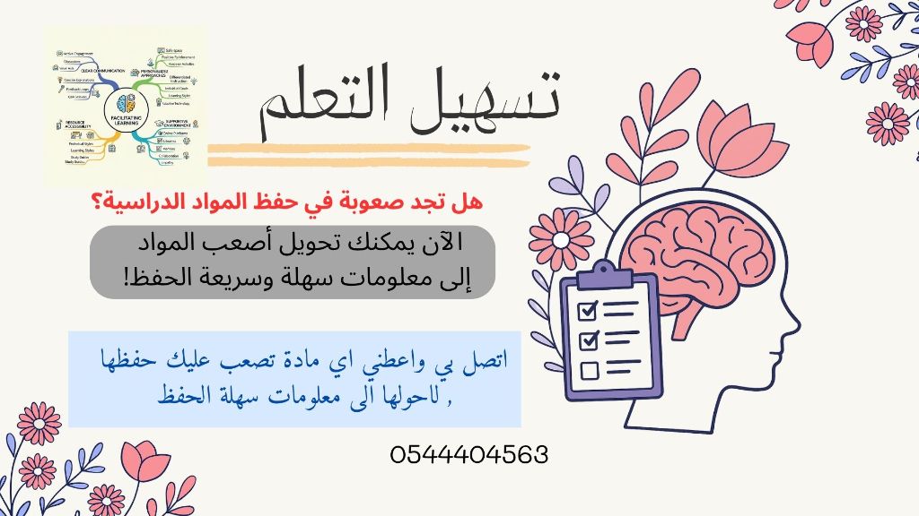 كتشف طريقتي المبتكرة في تشفير المعلومة "حول المواد الصعبة الى معلومات سهلة تتذكرها بسرعة اربط المعلومة بشيء قريب منك، أو صيغة تجعلها تثبت في ذهنك فورا. ابدأ الدراسة بذكاء لا بصعوبة احجز جلستك الآن وخلي الحفظ متعة مو معناة