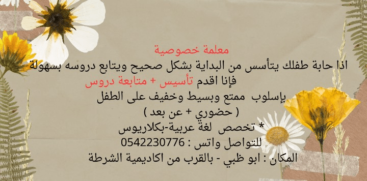 معلمة خصوصية اذا حابة طفلك يتأسس من البداية بشكل صحيح ويتابع دروسه بسهولة فإنا أقدم تأسيس + متابعة دروس بأسلوب ممتع وبسيط وخفيف على الطفل (حضوري + عن بعد) تخصص لغة عربية - بكالوريوس للتواصل