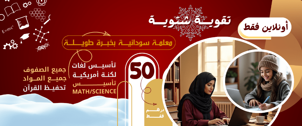 First Session Is (FREE) As A Trial. A Sudanese Teacher with an Excellent American Accent, Winter Tutoring for All Grades and Subjects and Quran Memorization) Competitive Price, Long Experience in Teaching Languages, Mathematics and All Subjects from Scratch. Make The Most of Their Free Time by Reading, Writing, Noticeable Improvement, Working on Weaknesses, And Quran. WhatsApp for Contact