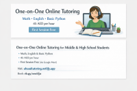 One - on - One Online Tutoring Math - English - Basic Python Struggling to keep up or just need things explained properly I offer private online tutoring focused on clarity, structure, and real understanding. Online sessions (Google Meet) AED45 per hour Middle & High School students First session free Learn more & book here