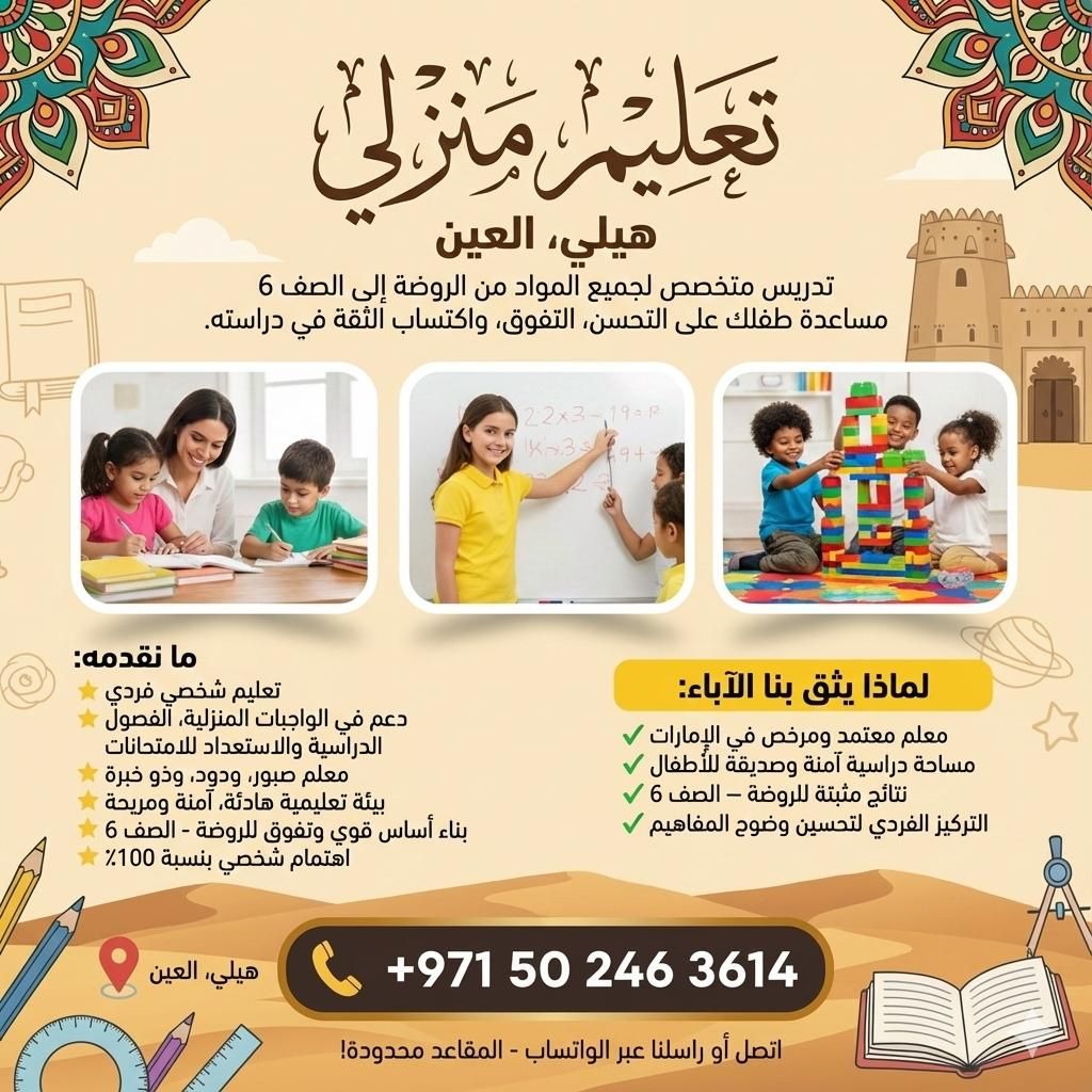 HOME Tuition - HILI, Al Ain - UAE. Dedicated tutoring for KG to Grade 6 (All Subjects) Helping your child improve, excel, and gain confidence in studies. What We Offer Personalized one - to one teaching. Support with homework, classwork & exam preparation. Patient, friendly, and experienced teacher. ADEK Approved) Calm, safe & comfortable learning environment. Strong foundation building & excellence