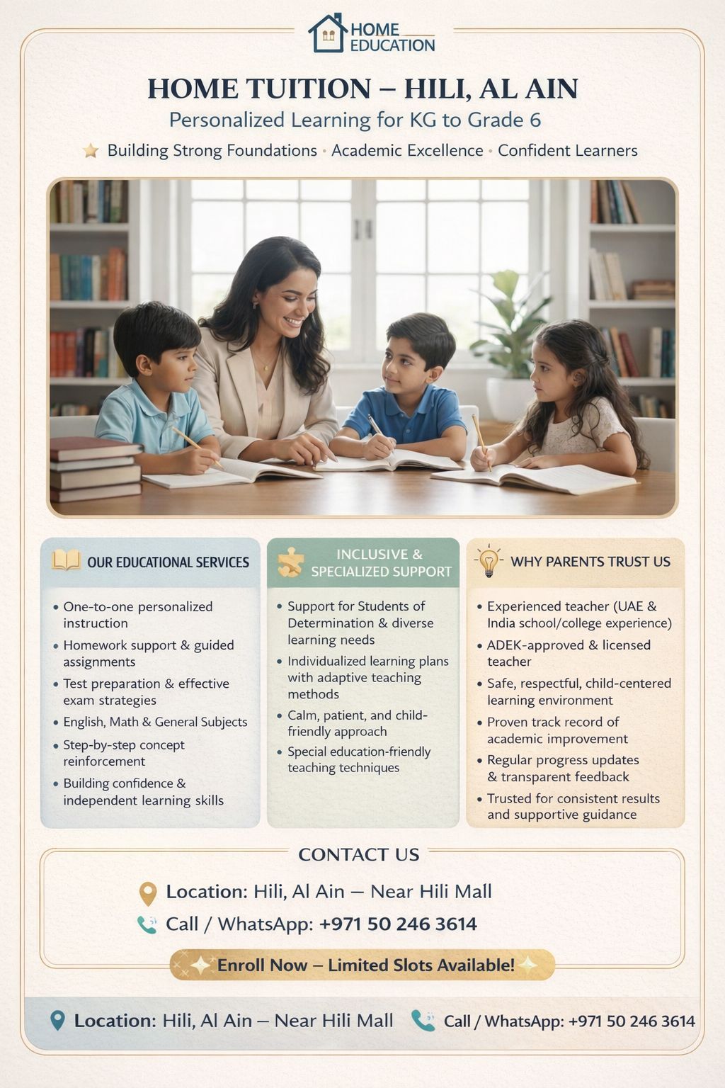 HOME Tuition - HILI, Al Ain - UAE. Dedicated tutoring for KG to Grade 6 (All Subjects) Helping your child improve, excel, and gain confidence in studies