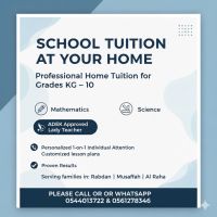 Professional Home Tuition for KG to 10th Core Subjects Mathematics - Science Why Choose Me ADEK Approved Lady Teacher - Personalized 1 - on - 1 Individual Attention - Customized lesson plans tailored to student needs - Proven Results and progress tracking Service Areas We come to you Serving families in Rabdan Mussafah Al Raha Maqta Contact NOW