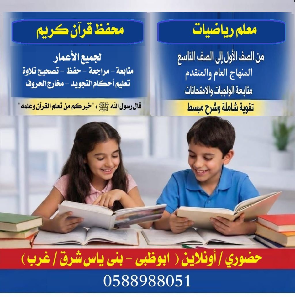 معلم رياضيات من الصف الأول وحتى التاسع منهاج عام ومتقدم / ومعلم قرآن كريم باحكام التجويد حفظ ومتابعة ومراجعة وتعليم احكام التجويد ومخارج الحروف متاح التعليم حضوري أو اونلاين