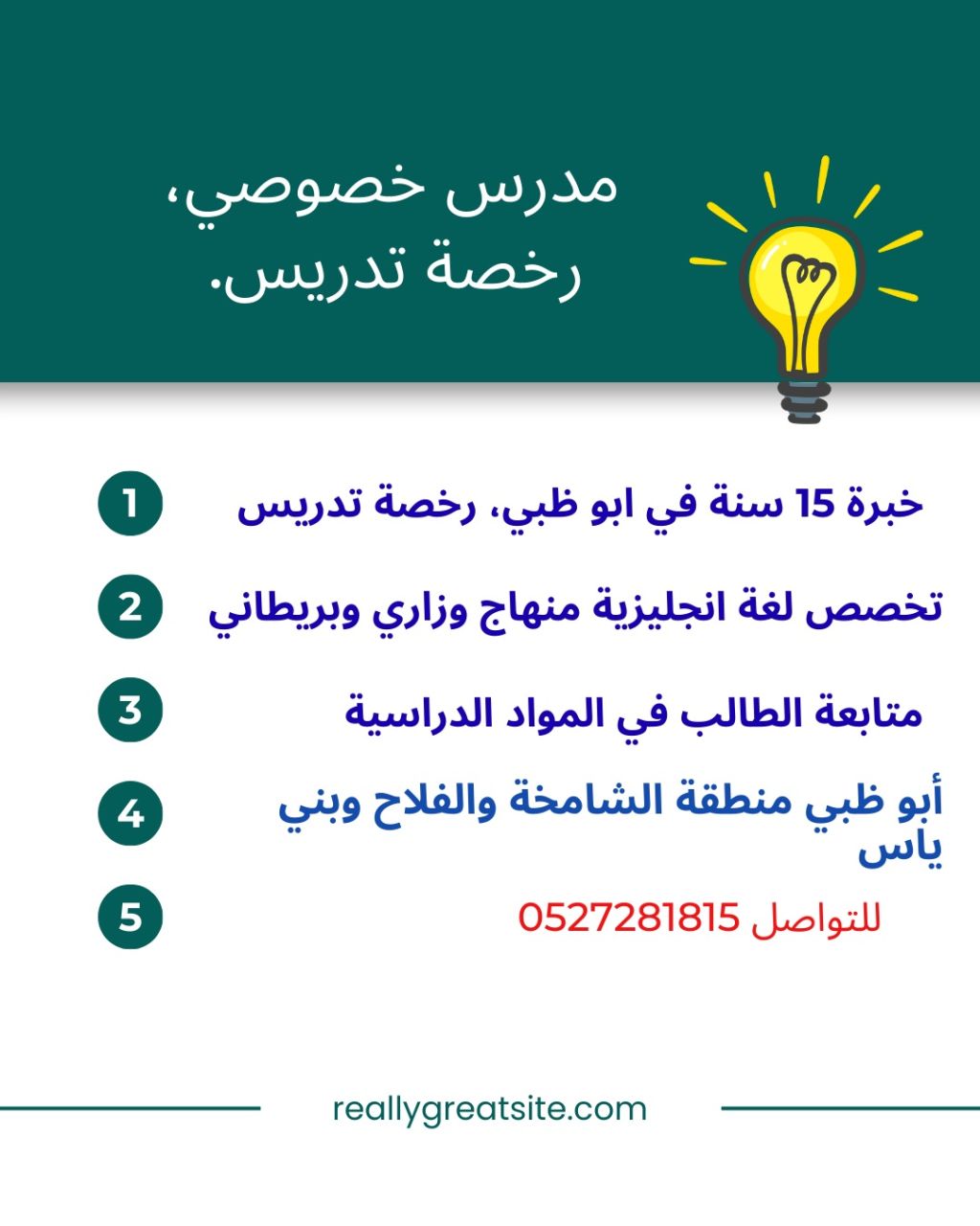 مدرس خصوصي رخصة تدريس لغة انجليزية لمتابعة الطالب في المواد الدراسية الفلاح بني ياس الشامخة