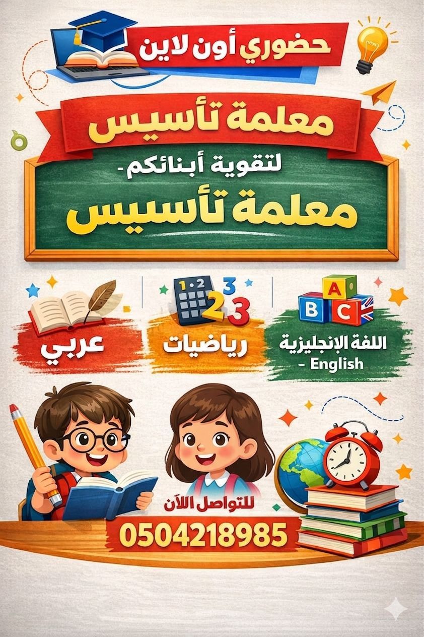 دروس تأسيس قوية في ثلاث مواد رياضيات لغة عربية لغة انجليزية شرح مبسط وسهل الفهم تأسيس من الصفر خطوة بخطوة تقوية المهارات الأساسية أنشطة وتمارين ممتعة متابعة مستمرة للطلاب هدفنا بناء أساس قوي وثقة في الدراسة سعر رمزي جدا الأماكن محدودة - سارع بالتسجيل Limited seats - Register now