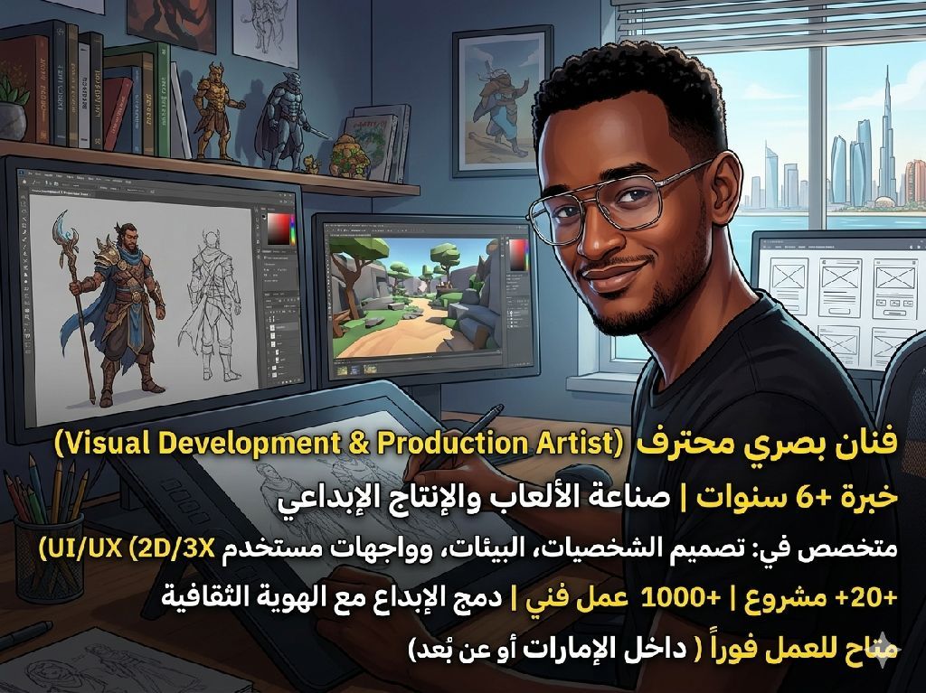 فنان بصري محترف (Visual Development & Production Artist) بخبرة تتجاوز 6 سنوات في صناعة الألعاب والانتاج الابداعي. متخصص في تصميم الشخصيات، البيئات، وواجهات المستخدم UI / UX، مع اتقان العمل ثنائي وثلاثي الأبعاد (2D / 3D) يمتلك خبرة قوية في الاخراج الفني وإدارة عملية الانتاج من الفكرة حتى التنفيذ النهائي. ساهم في أكثر من 20 مشروع وقدم ما يزيد عن 1000 عمل فني. يتميز بدمج الابداع مع الهوية الثقافية. م
