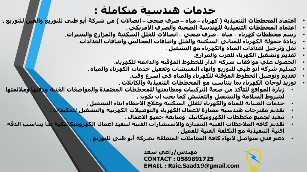 Electrical engineer available for electrical and plumbing services and adm addc adssc tra du drawing approval for engineering consultancies and construction works in Abu Dhabi ELECTRICAL ENGINEER IN Abu Dhabi FOR DRAWING APPROVALS (Electricity - WATER SUPPLY - Etisalat - drainage) FOR VILLS - BUILDINGS - FARMS - IZZBAH AND LOAD UPGRADE AND METER SHIFTINGS